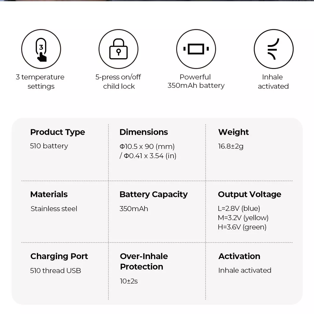 - ΡυθμιζόμενοΡυθμίσεις τάσης: Επιλέξτε μεταξύ 2.8V, 3.2V και 3.6V για μια προσαρμοσμένη εμπειρία ατμίσματος